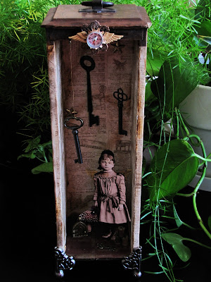 It's an old card catalog drawer with 3 old keys hanging from the inside top, some scrapbook papers decoupaged onto it and aged with ink and crackle medium. I printed and cutout an old picture of the little girl and the mushroom. The compass, wings, do dad, feet, little door and iris in her hand are all from Alpha Stamps.